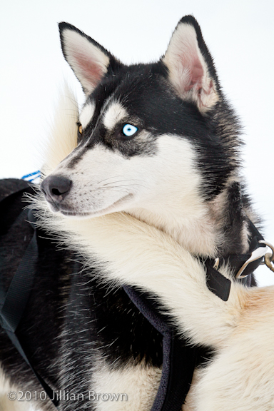 All the dogs that are used for our dog sledding are Alaskan Huskies. This means that they are a pure bread husky or siberian husky, mixed with some form of hound. Often a grey hound. We use Alaskan Huskies because our climate is too warm. All the dogs look very different because of this. Sometimes the hound traits come out more and sometimes the husky. The blue eyes, curly tail, and pointed ears are husky traits. The long slim body, long legs and long muzzle are all hound traits.